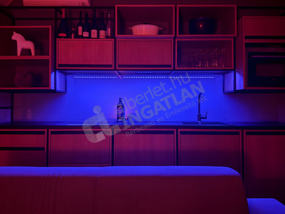 A nappali és a konyha egy légteret alkot, a gépek (mosogatógép, indukciós főzőlap, sütő, mikrohullámú sütő, mosó- és szárítógép) rejtett beépítéssel kerültek elhelyezésre.