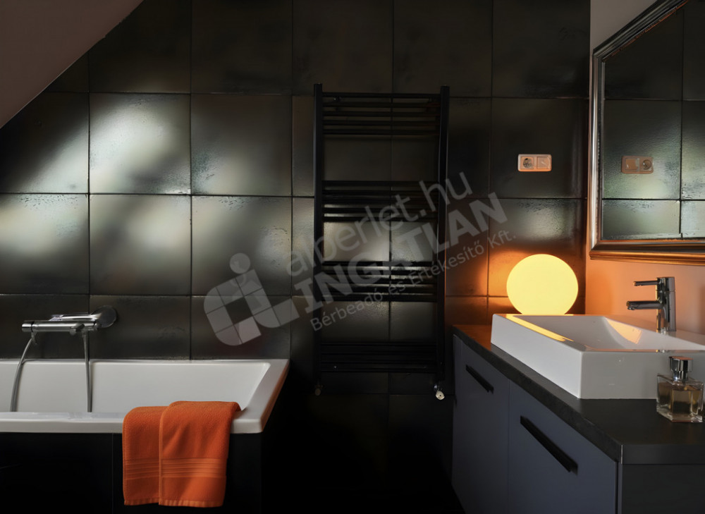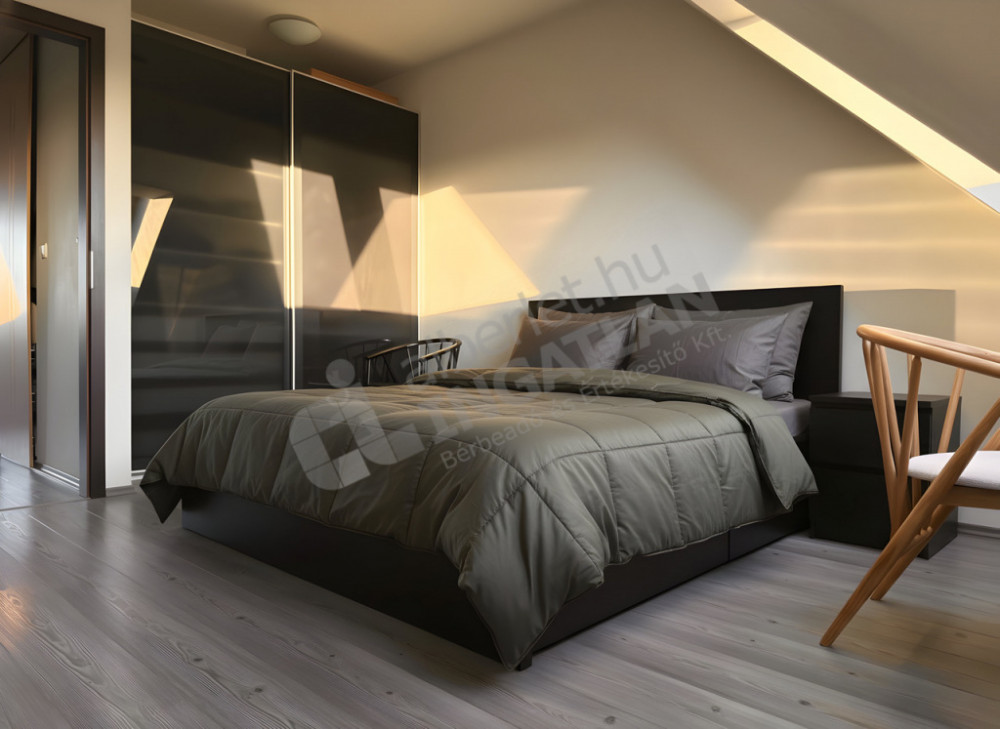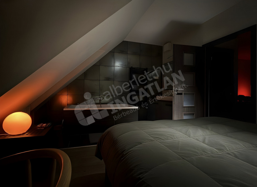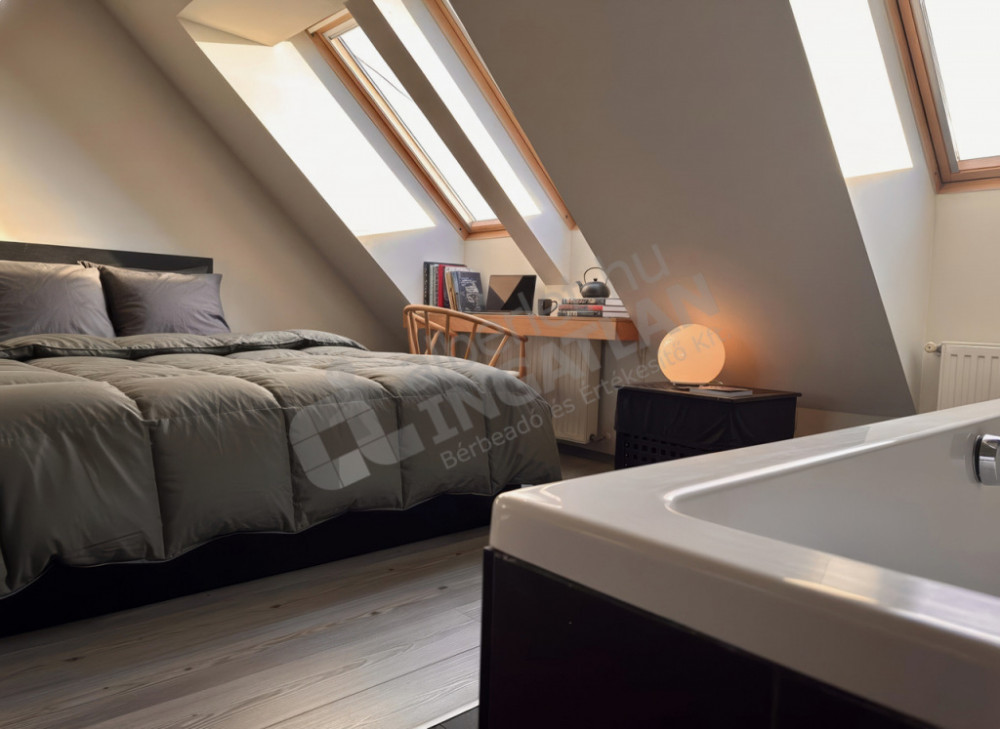 A hálószoba és a fürdő összenyitott, különleges térélményt nyújtó megoldás.