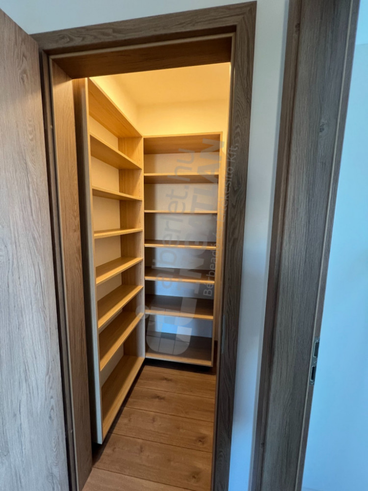 A belső terek kialakításánál prémium belsőépítészeti megoldások dominálnak: ízléses beépített bútorok, magas minőségű anyaghasználat és átgondolt tárolókapacitás jellemzi. A konyha teljesen gépesített; az előszobában, hálókban és kiszolgálóhelyiségekben egyedileg gyártott bútorzat, nagyméretű szekrények és praktikus tárolók biztosítják a kényelmet. A lakáshoz külön polcozott tárolóhelyiség is tartozik.