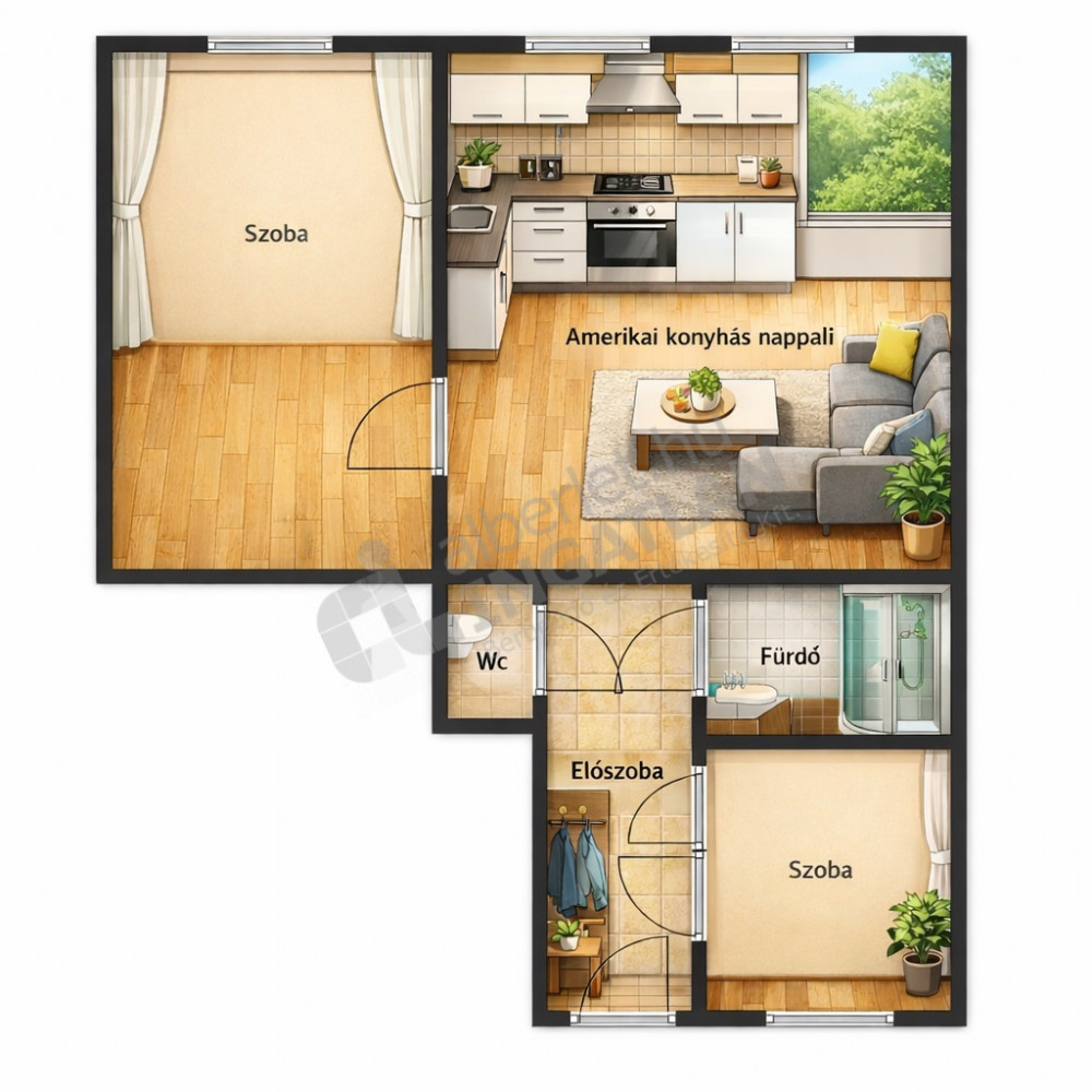 Beköltözés feltétele: 2 havi kaució és 1 havi bérleti díj megfizetése, közjegyzői nyilatkozat.