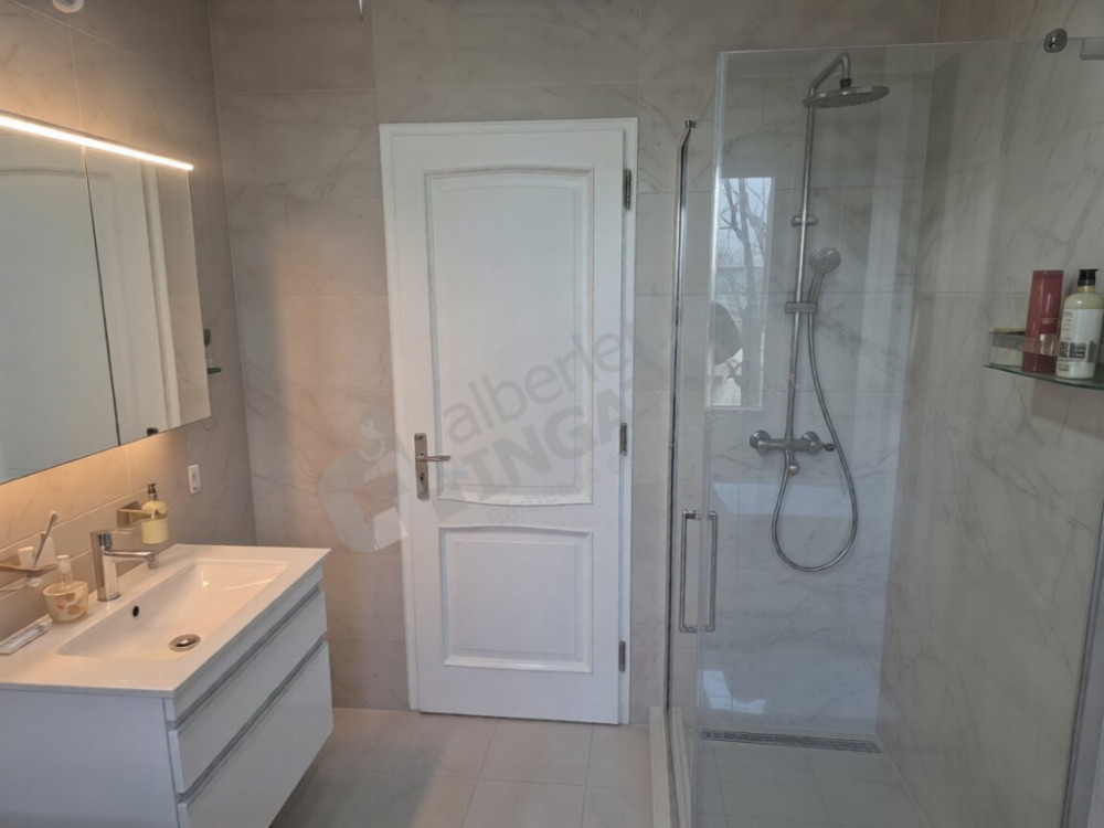 frissen felújított fürdőszoba káddal, külön zuhanyzóval, mosdóval és beépített bidé funkciós fali WC-vel