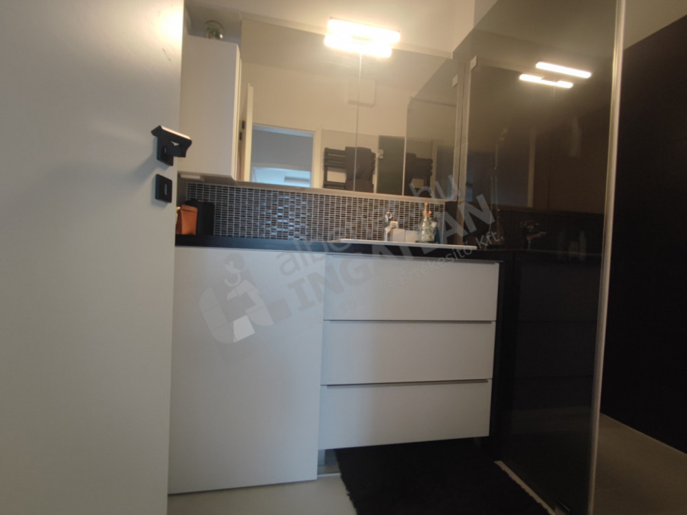 Az ingatlan lakberendező közreműködésével megálmodott, egyedi tervezésű és gyártású bútorokkal berendezett, soha nem lakott.