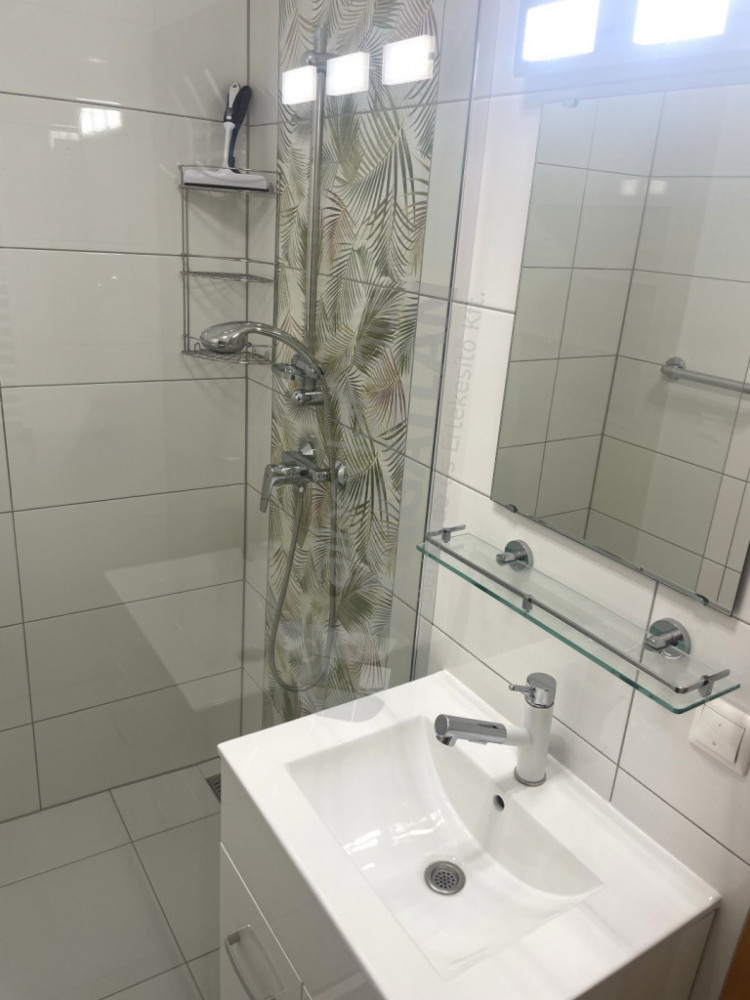 A fürdőszoba két éve teljes körű felújításon esett át, modern és igényes kialakítású.