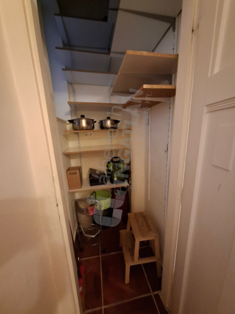 A lakásba lépve egyből a konyhába érkezünk, melynek ablaka a gangra nyílik. Balra egy kamra található.