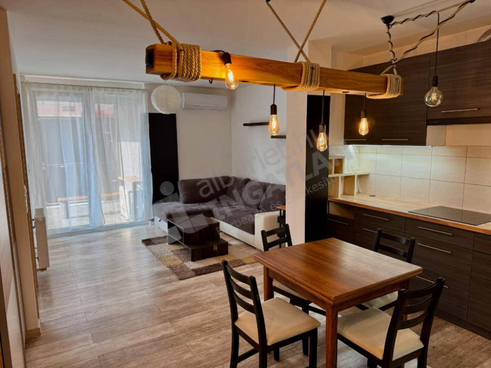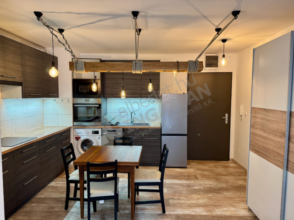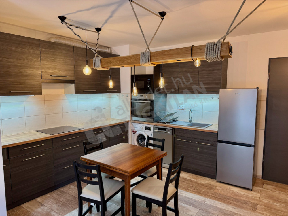 A lakás modern kialakítású, minőségi burkolatokkal és gépesített amerikai konyhás nappalival rendelkezik.