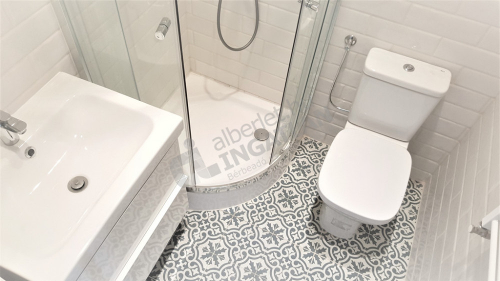 A fürdőszobában praktikus zuhanykabin van, WC és modern mosdó található. WIFI-van.