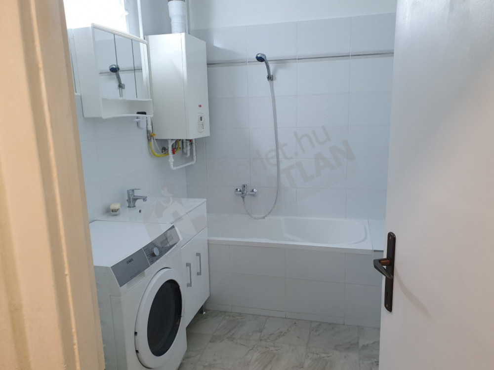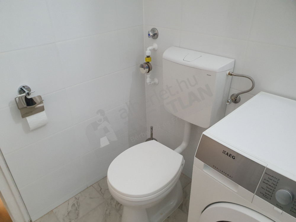 A kádas fürdőszoba és a WC egy helyiségben található, itt egy 7 kg-os mosógép is helyet kapott.